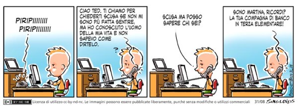 Martina: Ciao Ted. Ti chiamo per chiederti scusa se non mi sono fatta più sentire, ma ho conosciuto l’uomo della mia vita e non sapevo come dirtelo. – Ted: Scusa ma posso sapere chi sei? – Martina: Sono Martina, ricordi? La tua compagna di banco in terza elementare!