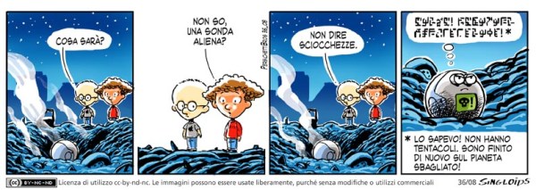 Sid: Cosa sarà? – Bob: Non so. Una sonda aliena? – Sid: Non dire sciocchezze. – Robot: Lo sapevo! Non hanno tentacoli. Sono finito di nuovo sul pianeta sbagliato!
