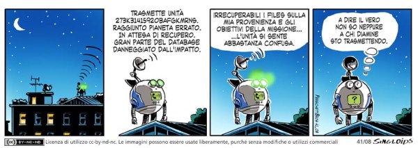 Robot: Trasmette unità 273K3141592OBAFGKMRNS. Raggiunto pianeta errato. In attesa di recupero. Gran parte del database danneggiato dall’impatto. Irrecuperabili i files sulla mia provenienza e gli obbiettivi della missione… …l’unità si sente abbastanza confusa. A dire il vero non so neppure a chi diamine sto trasmettendo.