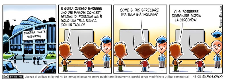 Ted: E quindi questo sarebbe uno dei famosi concetti spaziali di Fontana! Ma è solo una tela bianca con un taglio! – Bob: Come si può sfregiare una tela già tagliata? – Ted: Ci si potrebbe disegnare sopra la Gioconda.