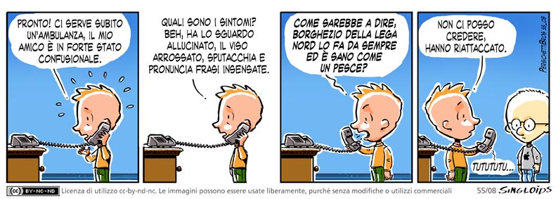 Ted: Pronto! ci serve subito un’ambulanza, il mio amico è in forte stato confusionale. – Ted: Quali sono i sintomi? Beh, ha lo sguardo allucinato, il viso arrossato, sputacchia e pronuncia frasi insensate. – Ted: Come sarebbe a dire, borghezio della lega nordi lo fa da sempre ed è sano come un pesce? – Ted: non ci posso credere, hanno riattaccato.
