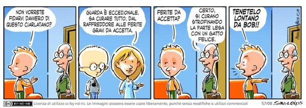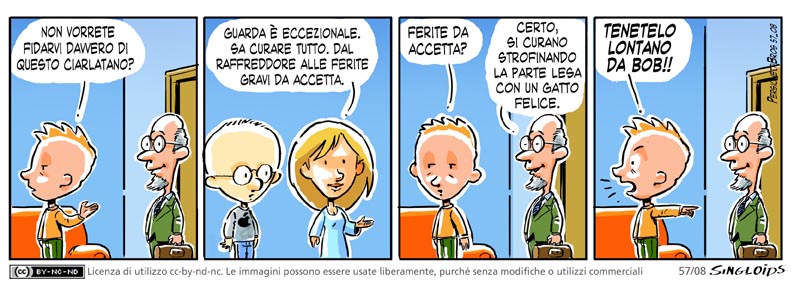 Ted: non vorrete fidarvi davvero di questo ciarlatano? – Gea: Guarda è eccezionale. Sa curare tutto. Dal raffreddore alle ferite gravi da accetta. – Ted: Ferite da accetta? – Naturopata: certo, si curano strofinando la parte lesa con un gatto felice. – Ted: TENETELO LONTANO DA BOB!