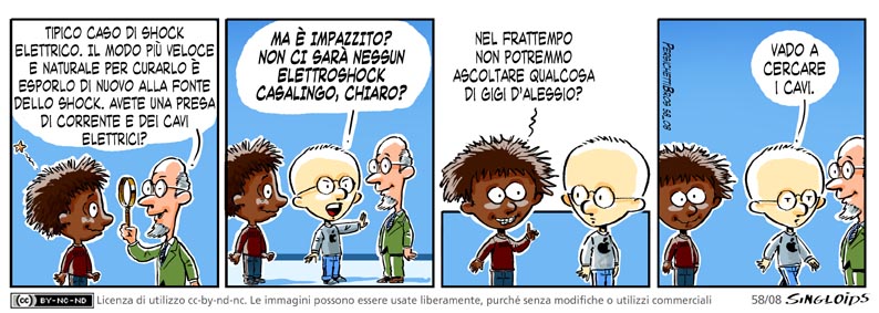 Naturopata: Chiaro caso da shock elettrico. Il modo più veloce e naturale per curarlo è esporlo di nuovo alla fonte dello shock. Avete una presa di corrente e dei cavi elettrici? – Sid: Ma è impazzito? Non ci sarà nessun elettroshock casalingo, chiaro? – Bob: Nel frattempo non potremmo ascoltare qualcosa di Gigi d’Alessio? – Sid: Vado a cercare i cavi.