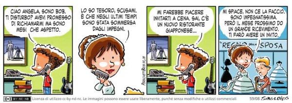 Bob: Ciao Angela, sono Bob. Ti disturbo? Avevi promesso di richiamarmi ma sono mesi che aspetto. – Angela: Lo so tesoro, scusami. E’ che negli ultimi tempi sono stata sommersa dagli impegni. – Bob: Mi farebbe piacere invitarti a cena. Sai, c’è un nuovo ristorante giapponese… – Angela: Mi spiace, non ce la faccio. Sono impegnatissima. Però il mese prossimo do un grande ricevimento. Ti farò avere un invito.