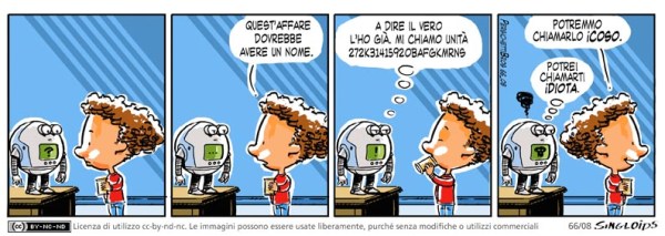 Bob: Quest’affare dovrebbe avere un nome. – iCoso: A dire il vero l’ho già. Mi chiamo unità 272K3141592OBAFGKMRNS. – Bob: Potremmo chiamarlo iCoso. – iCoso: Potrei chiamarti iDiota.
