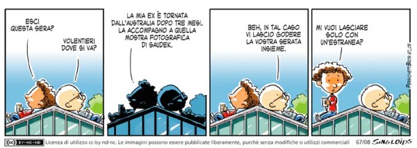 Bob: Esci questa sera. – Sid: Volentieri. Dove si va? – Bob: La mia ex è tornata dall’Australia dopo tre mesi. La accompagno a quella mostra fotografica di Saudek. – Sid: Beh, in tal caso vi lascio godere la vostra serata insieme. – Bob: Mi vuoi lasciare solo con un’estranea?
