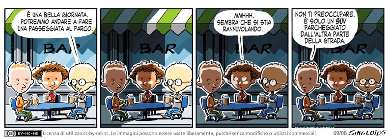 Sid: E’ una bella giornata. Potremmo andare a fare una passeggiata al parco. – Bob: Mmhhh… sembra che si stia rannuvolando. – Ted: Non ti preoccupare. E’ solo un SUV parcheggiato dall’altra parte della strada.