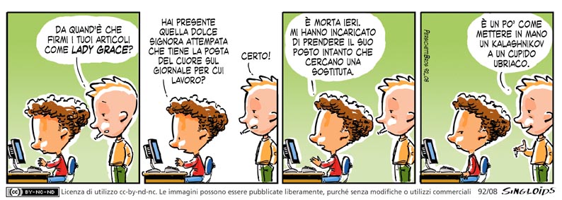 Ted: Da quand’è che firmi i tuoi articoli come Lady Grace? – Bob: Hai presente quella dolce signora attempata che tiene la posta del cuore sul giornale per cui lavoro? – Ted: Certo! – Bob: E’ morta ieri. Mi hanno incaricato di prendere il suo posto intanto che cercano una sostituta. – Ted: E’ un po’ come mettere in mano un Kalashnikov a un cupido ubriaco.