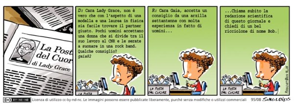 Gaia82: Cara Lady Grace non è vero che con l’aspetto di una modella e una laurea in fisica sia facile trovare il partner giusto. Credimi, pochi uomini accettano una donna che si divide tra il suo lavoro al CNR e le serate a suonare in una rock band. Qualche consiglio? Gaia82 – Bob: Cara Gaia, accetta un consiglio da una arzilla settantenne con molta esperienza in fatto di uomini… – Bob: Chiama subito la redazione scientifica di questo giornale e chiedi di un bel ricciolone di nome Bob.
