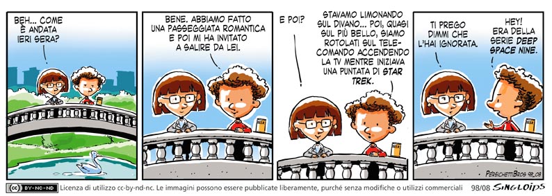 Meg: Beh come è andata ieri sera? – Bob: Bene. Abbiamo fatto una passeggiata romantica e mi ha invitato a salire da lei. – Meg: E poi? – Bob: Stavamo limonando sul divano… poi, quasi sul più bello, siamo rotolati sul telecomando accendendo la tv mentre iniziava una puntata di Star Trek. – Meg: Ti prego dimmi che l’hai ignorata. – Bob: Hey! era della serie Deep Space Nine.