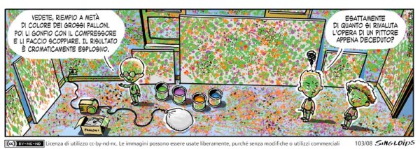 Sid: Vedete riempio a metà di colore dei grossi palloni. Poi li gonfio con il compressore e li faccio scoppiare. Il risultato è cromaticamente esplosivo. – Ted: Esattamente di quanto si rivaluta l’opera di un pittore appena deceduto?