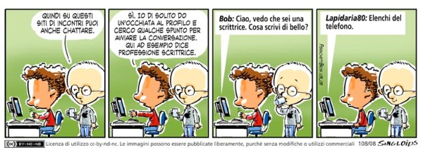 Sid: Quindi su questi siti di incontri puoi anche chattare. – Bob: Si. Io di solito do un’occhiata al profilo e cerco qualche spunto per avviare la conversazione. Qui ad esempio dice professione scrittrice. – Bob: Ciao, vedo che sei una scrittrice. Cosa scrivi di bello? – Lapidaria80: Elenchi del telefono.