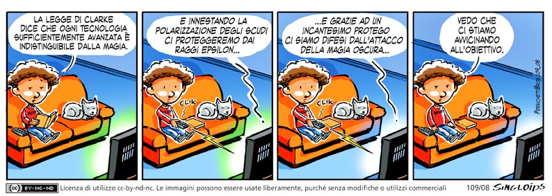 Bob:la legge di Clarke dice che Ogni tecnologia sufficientemente avanzata è indistinguibile dalla magia. – TV: …e innestando la polarizzazione degli scudi ci proteggeremo dai raggi epsilon… – TV: …e grazie ad un incantesimo protego ci siamo difesi dal attacco della magia oscura… – Bob: Vedo che ci stiamo avvicinando all’obiettivo.