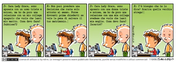 Dubbiosa72: Cara Lady Grace, sono sposata con un uomo triste e noioso, ma ho da poco una relazione con un mio collega spagnolo che vuole che lasci mio marito. Cosa devo fare? Dubbiosa72 – Bob: Non puoi prendere una decisione che ruota solo attorno al sesso. Forse dovresti prima chiederti se vale la pena di salvare il tuo matrimonio. – Incerto67: Cara Lady Grace, sono sposato con una donna triste e noiosa, ma ho da poco una relazione con una mia collega svedese che vuole che lasci mia moglie. Cosa devo fare? Incerto67 – Bob: C’è bisogno che te lo dica? Scarica quella vecchia strega!