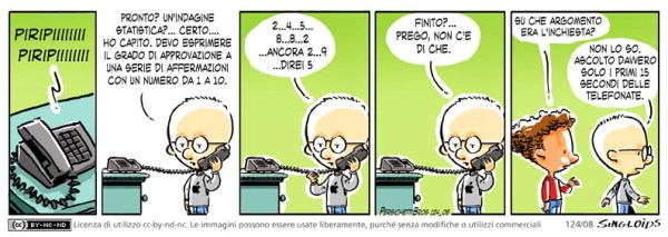 Sid: Pronto? Un indagine statistica? Certo…. ho capito. Devo esprimere il grado di approvazione a una serie affermazioni con un numero da 1 a 10. – Sid: 2…4…5…8…8…2…ancora 2…9…direi 5 – Sid: Finito? …Prego, non c’è di che. – Bob: Su che argomento era l’inchiesta? – Sid: Non lo so. Ascolto davvero solo i primi 15 secondi delle telefonate.