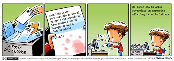 Dizzy74: Ieri sera mio marito mi ha detto che secondo lui bevo troppo e che ho bisogno di aiuto. Cosa ne pensi? Dizzy74 – Bob: Penso che tu abbia rovesciato un margarita alla fragola sulla lettera.