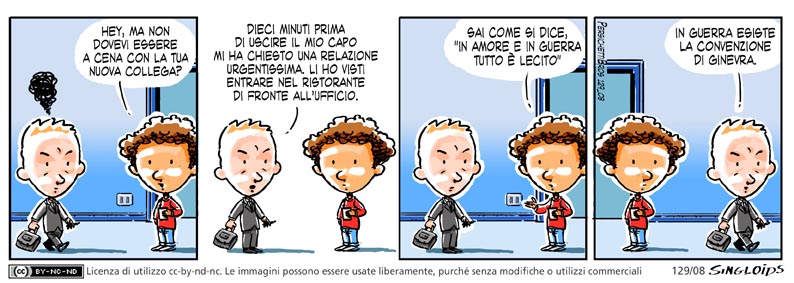 Bob: Hey, ma non dovevi essere a cena con la tua nuova collega? – Ted: Dieci minuti prima di uscire il mio capo mi ha chiesto una relazione urgentissima. Li ho visti entrate nel ristorante di fronte all’ufficio. – Bob: Sai come si dice, “in amore e in guerra tutto è lecito” – Ted: In guerra esiste la convenzione di Ginevra.