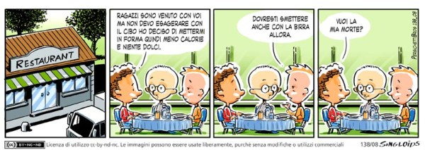 Bob: Ragazzi sono venuto con voi ma non devo esagerare con il cibo. Ho deciso di mettermi in forma quindi meno calorie e niente dolci. – Ted: Dovresti smettere anche con la birra allora. – Bob: Vuoi la mia morte?