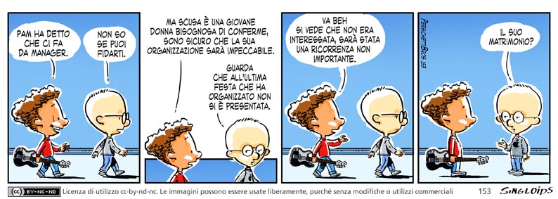 Bob: Pam ha detto che ci fa da manager. – Sid: Non so se puoi fidarti. – Bob: Ma scusa è una giovane donna bisognosa di conferme, sono sicuro che la sua organizzazione sarà impeccabile. – Sid: Guarda che all’ultima festa che ha organizzato non si è presentata. – Bob: Va beh si vede che non era interessata, sarà stata una ricorrenza non importante. – Sid: Il suo matrimonio?