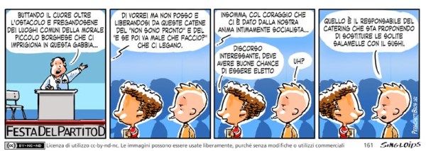 Comiziante: Buttando il cuore oltre l’ostacolo e fregandosene dei luoghi comuni e della morale piccolo borghese che ci imprigiona in questa gabbia. – Bob: Discorso interessante, deve avere buone chance di essere eletto. – Comiziante:..Di vorrei ma non posso e liberandosi da queste catene del “non sono pronto” e del “e se poi va male che faccio?” che ci legano. – Ted: uh? – Comiziante: Insomma, col coraggio che ci è proprio e ci contraddistingue e che ci è dato dalla nostra anima intimamente socialista… – Ted: Quello è il direttore del catering che sta proponendo di sostituire le solite salamelle con il sushi.