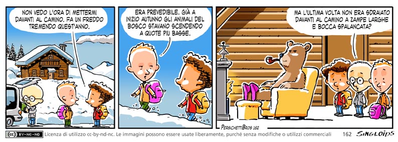 Bob: Non vedo l’ora di mettermi davanti al camino. Fa un freddo tremendo quest’anno. – Ted: Era prevedibile. Già a inizio autunno gli animali del bosco stavano scendendo a quote più basse. – Sid: Ma l’ultima volta non era sdraiato davanti al camino a zampe larghe e bocca spalancata?