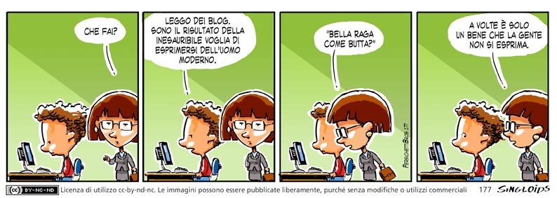 Meg: Che fai? – Bob: Leggo dei blog. Sono il risultato della inesauribile voglia di esprimersi dell’uomo moderno. Meg: “bella raga come butta?” – Meg: A volte è solo un bene che la gente non si esprima.