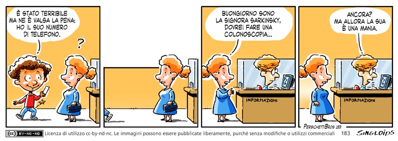 Bob: E’ stato terribile ma ne è valsa la pena: ho il suo numero di telefono. – Signora: Buongiorno, sono la signora Sarkinsky, dovrei fare una colonoscopia. – Receptionist: Ancora? Ma allora la sua è una mania.
