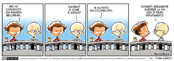 Bob: Ieri ho conosciuto una ragazza bellissima. – Sid: Davvero? E come è andata? – Bob: Mi ha fatto una colonscopia. – Sid: Dovresti seriamente rivedere la tua idea di primo appuntamento.