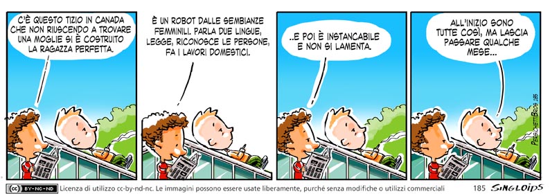 Bob: C’è questo tizio in Canada che non riuscendo a trovare una moglie si è costruito la ragazza perfetta. – Bob: E’ un robot dalle sembianze femminili. Parla due lingue, legge, riconosce le persone, fa i lavori domestici.. – Bob: ..e poi è instancabile e non si lamenta. – Ted: All’inizio sono tutte così, ma lascia passare qualche mese…