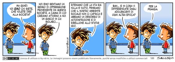 Bob: ma quindi voi emo chi siete, che volete dire alla società? – Emo: Noi emo sentiamo come un senso di oppressione proveniente dalla società odierna e a causa di ciò ci creiamo un guscio attorno per isolarci. Riteniamo che la vita sia nulla e vuoto: pensiamo che la società non ci capisca e abbiamo un desiderio di autodistruzione e di ribellione allo status quo. – Bob: Bah… e in cosa vi differenziate dagli adolescenti di ogni altra epoca? – Emo: Per la frangia.