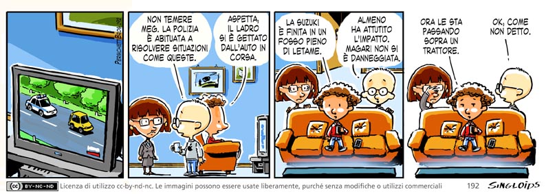 Sid: Non temere Meg. La polizia è abituata a risolvere situazioni come queste. – Bob: Aspetta, il ladro si è gettato dall’auto in corsa. – Bob: La Suzuki è finita in un fosso pieno di letame. – Sid: Almeno ha attutito l’impatto. Magari non si è danneggiata. – Bob: Ora le sta passando sopra un trattore. – Sid: Ok, come non detto.