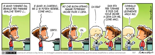 Gaia: E quindi tornerò dal Brasile per passare qualche tempo lì… – Gaia: E quindi mi chiedevo.. se ci si poteva vedere.. come amici… – Bob: Certo. – Gaia: So che suona strano.. magari potremmo uscire fuori a cena. – Bob: Ok. – Sid: chi era? – Bob: Gaia sta per tornare e dice che vuole uscire a cena con me, come amici. – Sid: Consiglio mutande leopardate amico mio.