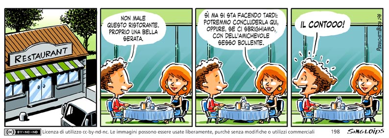 Bob: Non male questo ristorante, proprio una bella serata. – Gaia: Si ma si sta facendo tardi: potremmo concluderla qui oppure, se ci sbrighiamo, con dell’amichevole sesso bollente. – Bob: IL CONTOOO.
