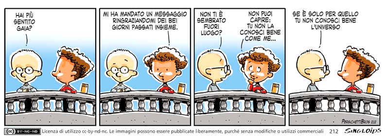 Sid: Hai più sentito Gaia? – Bob: Mi ha mandato un messaggio ringraziandomi dei bei giorni passati insieme. – Sid: Non ti è sembrato fuori luogo? – Bob: Non puoi capire: tu non la conosci bene come me… – Sid: Se è solo per quello tu non conosci bene l’universo