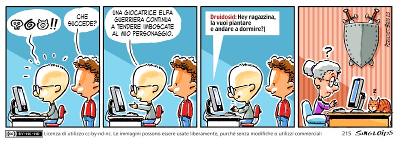 Bob: Che succede? – Sid: Una giocatrice elfa guerriera continua a tendere imboscate al mio personaggio. -Finestra chat: Druidosid: Hey ragazzina, la vuoi piantare e andare a dormire? – Vecchietta: ?