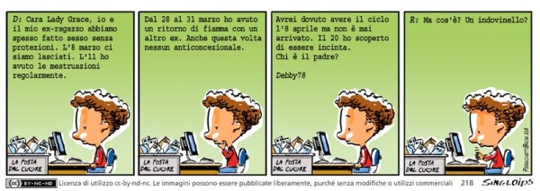 D: Io e il mio ex-ragazzo abbiamo spesso fatto sesso senza protezioni. L’8 marzo ci siamo lasciati. L’11 ho avuto le mestruazioni regolarmente. – D: Dal 28 al 31 marzo ho avuto un ritorno di fiamma con un altro ex. Anche questa volta nessun anticoncezionale. – D: Avrei dovuto avere il ciclo l’8 aprile ma non è mai arrivato. Il 20 ho scoperto di essere incinta. Chi è il padre? Debby78