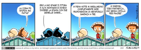 Bob: La cosa più stupida mai fatta? – Sid: Ero a uno stage di pittura in alta montagna e dovevo dividere la stanza con due gemelle danesi… – Sid: In piena notte mi svegliarono completamente nude proponendomi un metaforico sandwich a tre. – Sid: Io risposi: “Idea fantastica… uno senza cipolla per favore”.