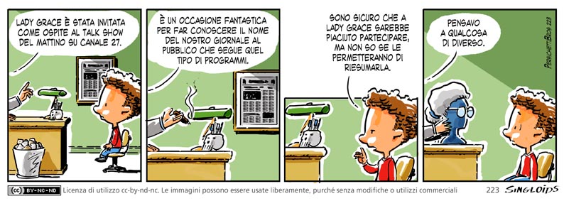 Capo: Lady Grace è stata invitata come ospite al talk show del mattino su Canale 27. – Capo: E’ un occasione fantastica per far conoscere il nome del nostro giornale al pubblico che segue quel tipo di programmi. – Bob: Sono sicuro che ha Lady Grace sarebbe piaciuto partecipare ma non so se le permetteranno di riesumarla. – Capo: Pensavo a qualcosa di diverso.