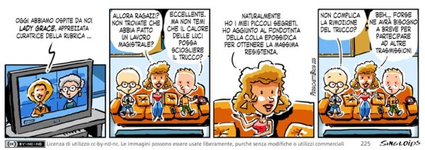 Presentatrice: Oggi abbiamo ospite da noi Lady Grace, apprezzata curatrice della rubrica … – Pam: Allora ragazzi? Non trovate che abbia fatto un lavoro magistrale? – Ted: Eccellente. Ma non temi che il calore delle luci possa sciogliere il trucco? – Pam: Naturalmente ho i miei piccoli segreti. Ho aggiunto al fondotinta della colla epossidica per ottenere la massima resistenza. – Sid: Non complica la rimozione del trucco? – Pam: Beh… forse ne avrà bisogno a breve per partecipare ad altre trasmissioni.