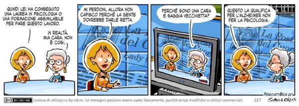 Intervistatrice: Quindi lei ha conseguito una laurea in psicologia o un training assimilabile per fare questo lavoro. – Bob: In realtà, mia cara, non è così. – Intervistatrice: allora non capisco perché la gente dovrebbe darle retta. – Bob: perché sono una cara e saggia vecchietta? – Intervistatrice glaciale: questo la qualifica per l’alzheimer non per la psicologia.