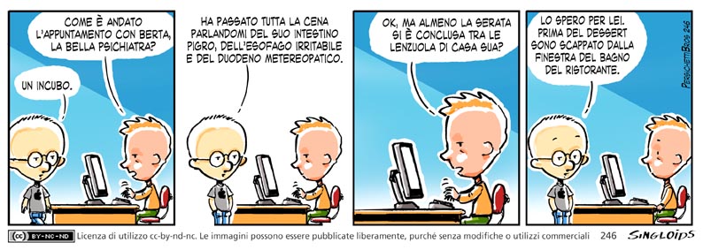 Ted: Come è andato l’appuntamento con Berta, la bella psichiatra? – Sid: Un incubo. – Sid: Ha passato tutta la cena parlandomi del suo intestino pigro, dell’esofago irritabile e del duodeno metereopatico. – Ted: Ok, ma almeno la serata sì è conclusa tra le lenzuola di casa sua? – Sid: Lo spero per lei. Prima del dessert sono scappato dalla finestra del bagno del ristorante.