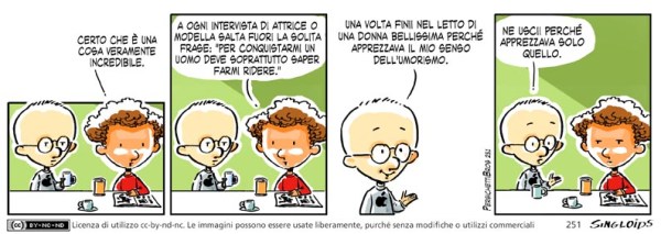 Bob: Certo che è una cosa veramente incredibile. – Bob:A ogni intervista di attrice o modella salta fuori la solita frase: “Per conquistarmi un uomo deve soprattutto saper farmi ridere.” – Sid: Una volta finii nel letto di una donna bellissima perché apprezzava il mio senso dell’umorismo. – Sid: Ne uscii perché apprezzava solo quello
