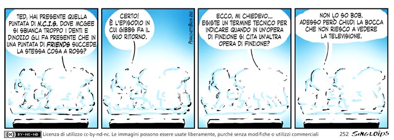 Bob: Ted, hai presente quella puntata di N.C.I.S. dove McGee si sbianca troppo i denti e DiNozzo gli fa presente che in una puntata di Friends succede la stessa cosa a Ross? – Ted: Certo! E’ l’episodio in cui Gibbs fa il suo ritorno. – Bob: Ecco, mi chiedevo… esiste un termine tecnico per indicare quando in un’opera di finzione si cita un’altra opera di finzione? – Ted: Non lo so Bob. Adesso però chiudi la bocca che non riesco a vedere la televisione.