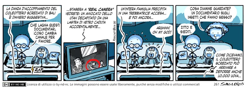 TV: La danza d’accoppiamento del coleottero screziato di Bali è davvero suggestiva… – Sid: Che lagna questi documentari, icoso cambia canale per favore. – TV: …stasera a “Real camera” vedrete: un avvocato dello Utah decapitato da un lastra di vetro caduta accidentalmente, un’intera famiglia precipita in una trebbiatrice accesa… e poi ancora… – TV: arghhh! oh my god! – Bob: Cosa diamine guardate? Un documentario sugli insetti che fanno sesso? – Sid: Zitto e siediti. – TV: Come dicevamo, il coleottero screziato può arrivare a deporre anche 10.000 uova…
