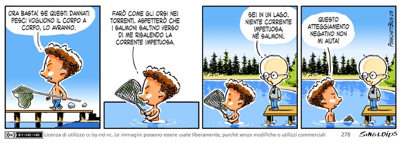 Bob: Ora basta! Se questi dannati pesci vogliono il corpo a corpo, lo avranno. – Bob: Farò come gli orsi nei torrenti. Aspetterò che i salmoni saltino verso di me risalendo la corrente impetuosa. – Sid: Sei in un lago. Niente corrente impetuosa, nè salmoni. – Bob: Questo atteggiamento negativo non mi aiuta!