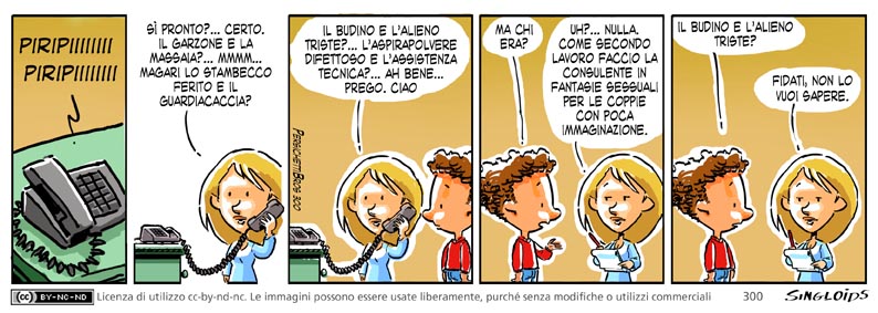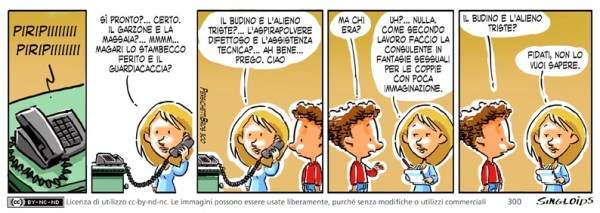 Gea: Sì pronto?… certo. Il garzone e la massaia?…mmmm… magari lo stambecco ferito e il guardiacaccia? – Gea: Il budino e l’alieno triste?… L’aspirapolvere difettoso e l’assistenza tecnica? … Ah bene… prego. ciao. – Bob: Ma chi era? – Gea: Nulla. Come secondo lavoro faccio la consulente in fantasie sessuali per le coppie con poca immaginazione. – Bob: Il budino e l’alieno triste? – Gea: Fidati, non lo vuoi sapere.