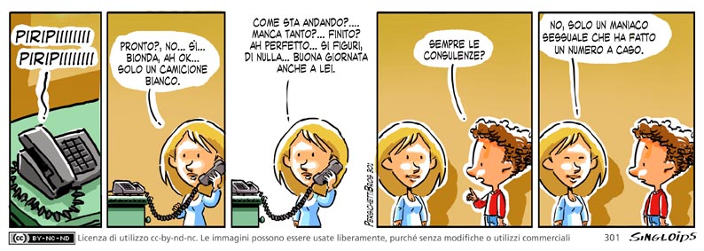 Gea: Pronto? No… sì… bionda, ah ok… solo un camicione bianco. – Gea: Come sta andando?…. manca tanto?… finito? ah perfetto… si figuri, di nulla… buona giornata anche a lei. – Bob: Sempre le consulenze? – Gea: No, solo un maniaco sessuale che ha fatto un numero a caso.
