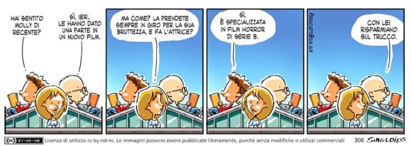 Bob: Hai sentito Molly di recente. – Sid: Si, ieri. Le hanno dato una parte in un nuovo film. – Gea: Ma come? La prendete sempre in giro per la sua bruttezza, e fa l’attrice? – Bob: Si. E’ specializzata in film horror di serie B. – Sid: Con lei risparmiano sul trucco.