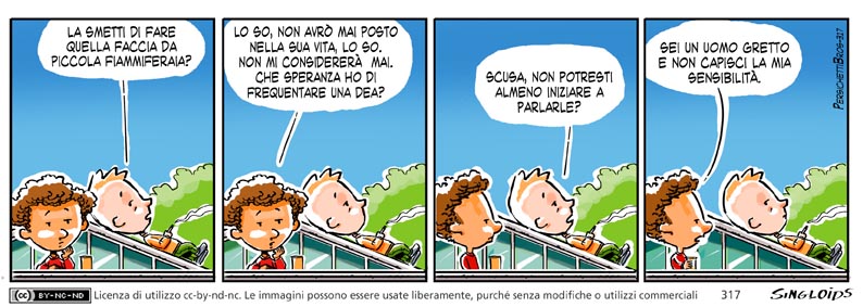 Sid: La smetti di fare quella faccia da piccola fiammiferaia? – Bob: Lo so non avrò mai posto nella sua vita, lo so. Non mi considererà mai, che speranza ho di frequentare una dea? – Sid: Scusa, non potresti almeno iniziare a parlarle? – Bob: Sei un uomo gretto e non capisci la mia sensibilità.