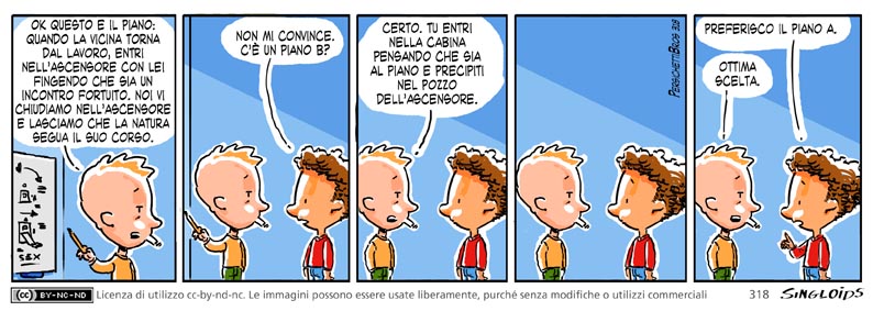 che sia un incontro fortuito. noi vi chiudiamo nell’ascensore e lasciamo che la natura segua il suo corso. – Bob: Non mi convince. C’è un piano B? – Ted: Certo. Tu entri nella cabina pensando che sia al piano e precipiti nel pozzo dell’ascensore. – Bob: Preferisco il piano A. – Ted: Ottima scelta.